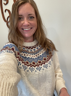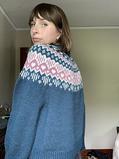 My second prototype is a size C, and it’s also a four-color version. It’s knitted in Pura Lana from Gepard Garn in the colors 780 Midnatsblå (color A), 101 Råhvid (color C), and 617 Støvet lilla (color D), as well as two strands of Merino from Knitting for Olive held together in the color Ballerina (color B). This resulted in a heavier garment than the initial prototype, but I love how it turned out. That being said, I wouldn’t recommend choosing a thicker yarn than Pura Lana (50 g = 115 m). Pura Lana is at the edge of what the gauge can handle (in my opinion :)).