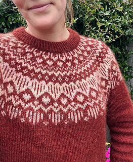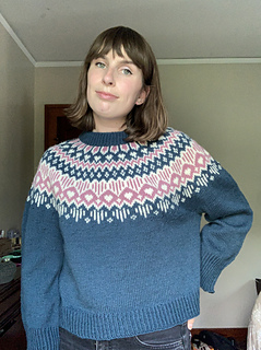 The Kindhearted Sweater is a slightly oversized sweater with a circular yoke in stranded colorwork knitting. The sweater is cast on using the provisional cast-on technique, after which the sweater’s yoke is worked from the bottom up, so the stitches of the colorwork hearts face the right way. Once the yoke is finished and the stitches have been bound off, new stitches are picked up along the neckline for the folded neckband. When the neckband is done, the stitches from the cast-on are transferred onto a circular needle, and the rest of the sweater is then worked top down. Short rows are worked at the bottom of the yoke in order to add extra length to the back and ensure a good fit. Lastly, the body and sleeves are worked in the round in stockinette stitch and finished with a rib edge.