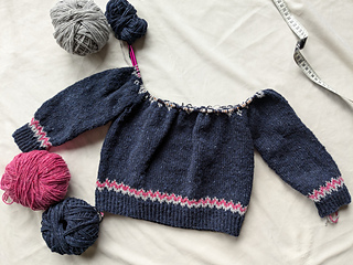 The Kindhearted Sweater Mini is worked from the bottom up with a circular yoke in stranded colorwork knitting, as well as small colorwork details above the ribbing on both body and sleeves. To begin with, the body and both sleeves are worked separately, after which the parts are joined and the yoke is worked in the round. On the larger sizes, short rows are worked at the bottom of the yoke before beginning the colorwork segment in order to add extra length to the back and ensure a good fit. Once the yoke is finished and the stitches have been bound off, new stitches are picked up along the neckline for the folded neckband. Lastly, the hole under each sleeve is seamed together using Kitchener Stitch.