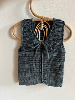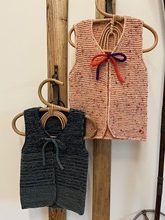 The vest is worked flat in garter stitch from the top down. You begin with the back piece, where increases are worked for the armholes. Then the front pieces are shaped one after the other using short rows, including increases for the neckline as well as increases under the arms. The i-cord edging is worked at the same time. After that, all pieces are joined, and the body is worked straight down. Finally, decreases are worked to shape the lower hem and the vest is bound off with an i-cord edge. At the very end, the cords are added.