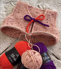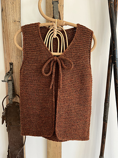 Die Weste wird kraus rechts in Reihen von oben nach unten gestickt. Begonnen wird mit dem Rückenteil, an dem Zunahmen für die Armausschnitte gearbeitet werden. Danach werden die Vorderteile nacheinander mit verkürzten Reihen geformt, Zunahmen für den Halsausschnitt und ebenso Zunahmen unter den Armen gestrickt. Dabei wird der Kordelrand direkt daran gestrickt. Danach werden alle Teile verbunden und der Rumpf gerade gestrickt. Abschließend werden zur Formung des unteren Saumes Abnahmen gestrickt und schließlich mit einem Kordelrand abgekettet. Schlussendlich werden Kordeln hinzugefügt.