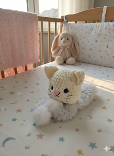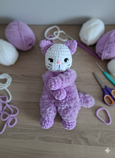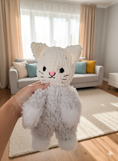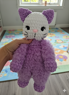 Kitty Lovey is a soft, flat-body amigurumi cat made with a mix of fur and chenille yarn for maximum cuddliness.