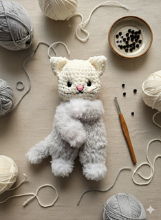 6 mm & 4.5 mm hooks, 14 mm safety eyes, polyester stuffing (head only), embroidery thread (black & pink), yarn needle, scissors, stitch marker.