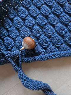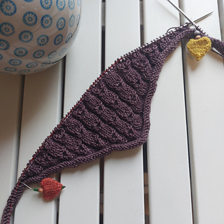 Just like the larger version, the smaller shawl is framed by rolled edges. Cute little hazelnuts line up between them. Starting with the maximum of stitches for the longest edge of the shawl, you shape a triangle with short rows and by adding stitches of the cord-like edge to the body of the shawl.