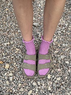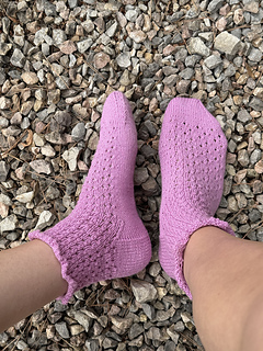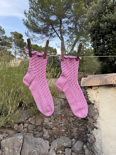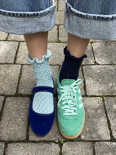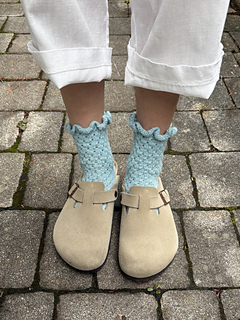 This sock pattern is worked from the top down, beginning with the ruffled cuff, followed by the leg, then the heel flap, and heel turn. After shaping the gusset, the foot is knit to the desired length, and finally, the toe is completed.