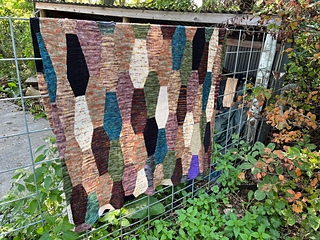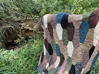 Coffin quilts are a traditional, though macabre part of American Crafting Tradition. In some iterations there is a “graveyard” in which coffins with the family member’s name are placed after they die. In this version the blanket is entirely pieced together by garter stitch coffins, with partial coffins around the edges to make the blanket square.