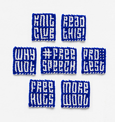 Knit Hello Statement Patches celebrate Craftivism, initiate textile communication and spread warmth and positivity. This makes it the perfect project for your Type/Knit Club not only on World Wide Knit in Public Day! Make your yarn talk and knit your own message!