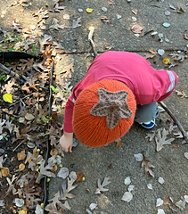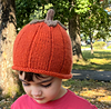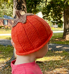 This pumpkin hat is the quintessential fall topper! The seasonal colors and detailed stem make it a fun way to ring in the fall season. It is knit from the bottom up with a rolled edge. Then the stem is knit separately and attached. This construction keeps the hat fitting comfortably with smooth top of head shaping and allows the stem to have more detail.