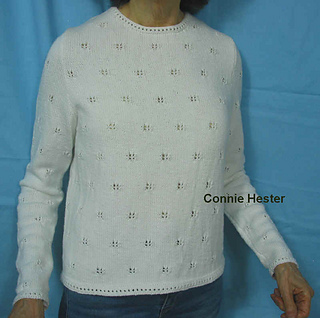 Body knit in the round up to the armholes. Sleeves knit flat, to allow for flexibility in adjusting desired width and shaping from cuff to underarm. Set-in sleeves. Garter Stitch eyelet edgings. Jewel neckline with single button closure at back neck. Optional overall eyelet pattern stitch may be eliminated for a plain canvas.
