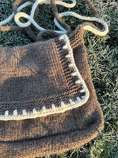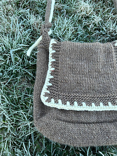 The pattern is suitable for beginner knitters and has detailed instructions with knitting schemes and explanatory videos. You can knit this bag very quickly as 9 mm (US 13) needles is used for this project. But it’s necessary to know how to single crochet to make the lap edge design - the pattern explains how to do it (there is also a YouTube tutorial that explains in detail how to crochet the edge of the lap), but you need to know the basics, such as how to hold the hook (this is not explained in detail in the pattern)