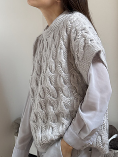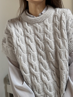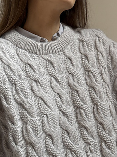 It’s an all over cable knit sweater worked from the top down. The back yoke is worked flat and shaped by increases. The shoulders are worked separately in rows. Then, they are joined by casting on stitches at the center front. The back and the front are joined at the underarms and the body is worked in the round. The stitches for the neckband are picked up along the neck edge and worked in rib. The stitches for the sleeves are picked up along the armholes and worked in the round to the cuff.