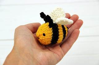 I made flat knitting version of bee pattern by turning rows. Antennaes and wings of a bee are knitted in separate parts and sewn to the base.