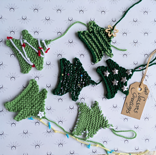 There are so many coloured and textured yarns, experiment with stash and scraps you may already have. A fast little knit that you can decorate and embellish or leave as it is. I made some yarn “tinsel” to wrap around the tree and used little star buttons, use whatever you have to personalise them. Pattern uses DK (8ply) yarn and 3.5mm needles.