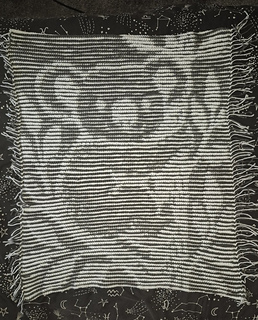 This pattern is written for 2 colors of yarn, any tapestry crochet (color changes) would be done manually and are not included in the pattern. This blanket can be made in any weight yarn, but I recommend worsted weight (4) to ensure the size. The pattern is 112 stitches across by 139 rows tall. If made with worsted weight yarn, the finished blanket should measure about 33” wide x 40” tall, not counting the fringe or border.