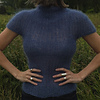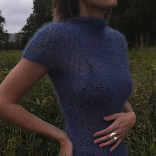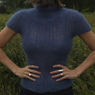 Kobolt is an airy yet close-fitting, short-sleeved blouse designed to be worn directly against the skin or layered over a lightweight camisole. The garment is worked top down in ribbing on circular needles, in one piece, with increases at each shoulder. Once the yoke has been shaped, the body is worked first while the stitches for the short sleeves are placed on hold. The sleeves are then worked separately.