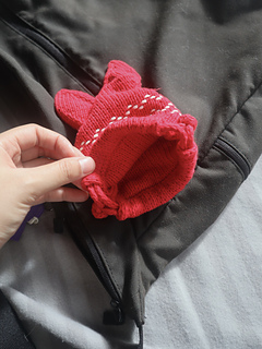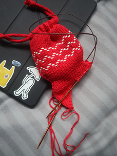 The drawstring hems are worked by picking up stitches along the divider on both sides and sewing them to the inside. The cords are made using the I-cord method and threaded through the hems.