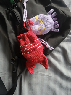 The fish scales are added by threading scrap yarn through the stitches according to the chart. The eyes are attached after the body is complete.
