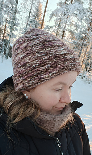 Kokko Beanie is a double-knit beanie designed for fingering-weight yarn. The hat is worked in the round as a tube. The work begins at the crown, is knit down to the brim, and then turned back upward to create a double-layered structure. The hat is finished with crown decreases.
