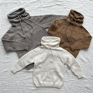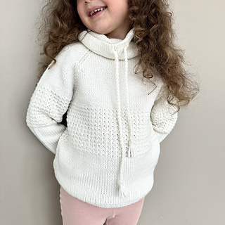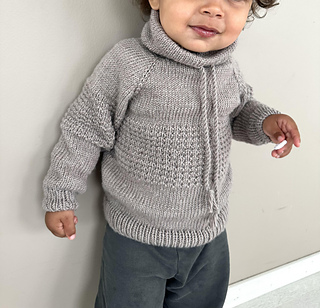 Kompisgenseren er en genser i glattstrikk og strukturmønster som passer både til gutter og jenter. Den strikkes ovenfra og ned med raglanøkninger. Genseren har tøffe detaljer som vid, høy hals med snorer.