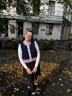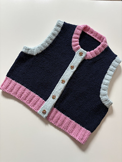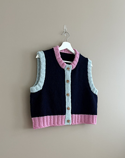 Korsvika Vest is a boxy crew neck vest with a double-knitted button band that is knit from the top down in stockinette stitch. Stitches are cast on for the back and German Short-Rows are worked to slightly slope the shoulders. The back panel is worked until the underarm, then stitches are picked up for the shoulders. The right and left front sections are worked separately, and the neckline and armholes are shaped on each panel with increases. The front panels are knit until the underarm, and stitches are cast on to connect the front sections to the to the back panel. The vest is then worked flat and ends in 2x2 ribbing. The armhole edges are picked up and knit double-folded in 2x2 ribbing, and stitches are picked up for the neckline, which is also worked double-folded in 2x2 ribbing. Finally, the double-knitted button band is worked, and the vest is finished with buttons.