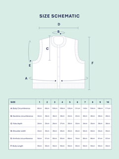The vest can be knit at a stitch gauge between 12-16 stitches per 10cm. Please find the finished measurements for those gauges below.