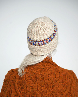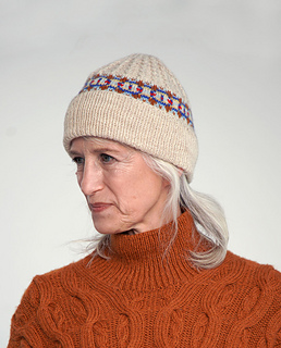 Kunna Hat is worked bottom up. First you work a wide ribbed border. The crown is worked first in stranded colourwork and then in a textured pattern with mock cables. Decreases are made at the top.