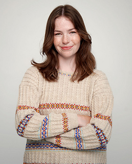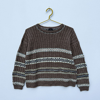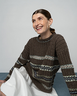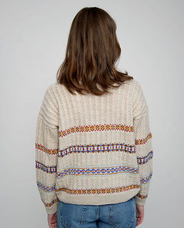 Kunna Sweater is worked bottom up in textured knitting and stranded colourwork. The body and sleeves are worked separately. The shoulders are joined together and cast off, and stitches are picked up for the neckband. Finally, the sleeves are joined to the body using mattress stitch.