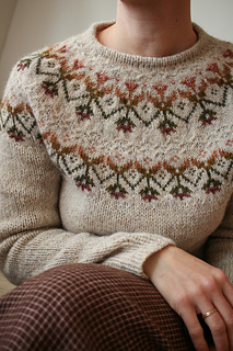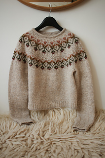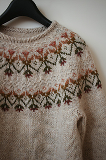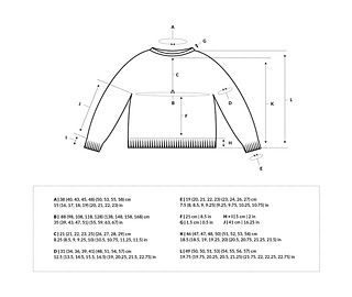 The pullover is knit top-down in the round. The pattern uses one main colour and small amounts of six contrasting colours, making it ideal for using up leftovers. It features a hemmed neckline, short-row shaping at the neck, a boxy body, and classic tapered sleeves. The yoke is worked with a single strand of fingering-weight yarn, and the body and sleeves with two strands held together.