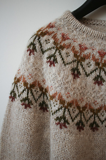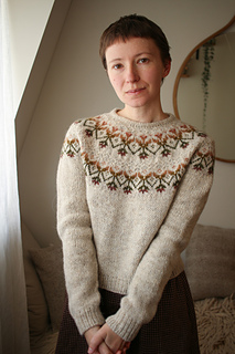 Kvit takes its name from the Ukrainian word kvitka, meaning “flower” — an inspiration that couldn’t be more fitting. Designed in the depths of grey winter, the pullover reflects my longing for spring and colour. The colourwork pattern combines stranded and inlay colourwork and crossed stitches. And the contrast between delicate yoke and more chunky body adds extra depth to the design.