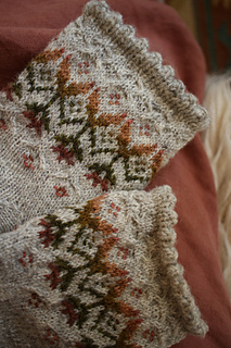 It’s a sister design to Kvit pullover featuring the same floral colourwork pattern. The socks are knit top-down in the round with a pattern, which combines stranded and inlay colourwork and crossed stitches, on the cuff and a short row heel.