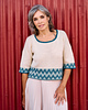The pattern panels on this jumper from Anniken Allis use a mosaic slip stitch pattern in teal and cream, and from a distance have an almost beaded appearance. The panels are worked around the lower body and sleeves; the garter stitch hems, cuffs and neckline are knitted in the teal colour. The design has a scoop neck and elbow-length sleeves, and is knitted in a blend of Bluefaced Leicester and cashmere from King Cole, called Naturally Soft 4ply.