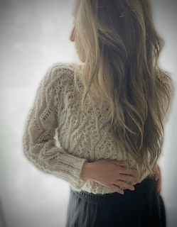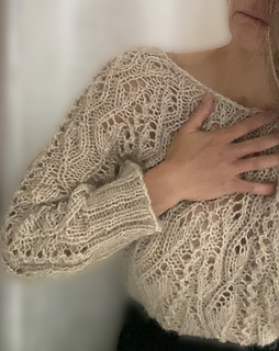 The yoke of this top down lace sweater for women sizes XS-XL is composed of growing wedges beginning from (a multiple of 6) + 1 stitches at neckline to (a multiple of 15) + 6 at bust. The first 6 stitches of the wedge are repeated at the end of the round for an edge panel. The lace pattern established in the wedge is continued down the body and sleeves of the sweater before a blousy ribbed finish at the hem and cuffs. The sweater is meant to be light and airy worn with a lot of positive ease but an ever so slightly cropped fit to balance out the billowy shape. This sweater can be knitted in the round and worn backwards or forwards. It can also be worked flat and worn as an open front cardigan.
