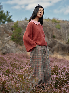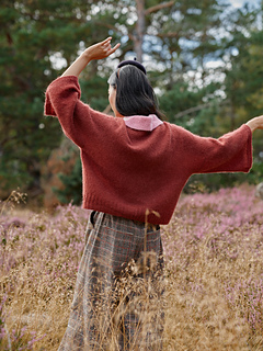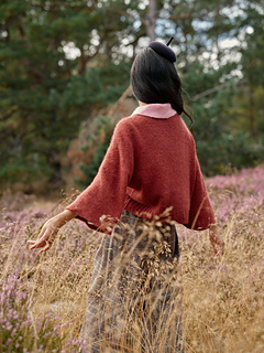 The airy, fluffy yarn lends lightness, making the shirt suitable for year-round wear. The sample is worked in a versatile, toned-down red paired with light pink, making it easy to combine with both lighter and darker shades. The design is worked top down with dropped shoulders and an oversized fit. It is finished with a deep ribbed hem, wide sleeves and a distinctive open collar shaped with an i-cord edge and ribbing.