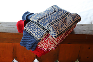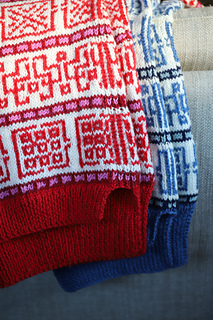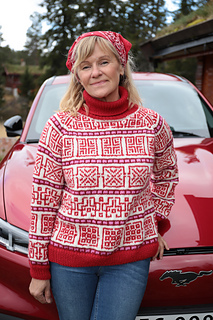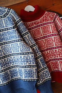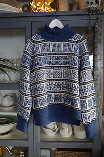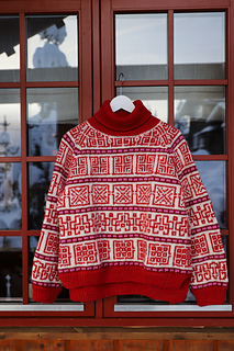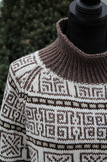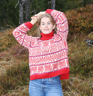 Labyrinth is a true treat for knitters who love colourwork – plenty of pattern to enjoy. The sweater has a generous fit with a gentle A-line shape and side slits at the hem. It is worked from the bottom up with raglan shaping and can be finished with either a simple neckband or a folded high neck. All labyrinth motifs in the charts have the same dimensions and can be interchanged as you like. Note: The yarn amounts are calculated for a sweater like the red and blue samples shown in the photos. If you use the main colour in the ribbing, you will need to adjust the number of skeins accordingly. Don’t get lost in the labyrinth – read through the pattern before you begin!