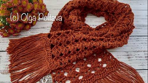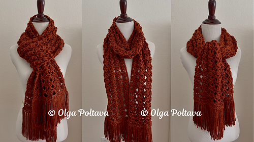 This is a pattern for a crochet lacy scarf, made with worsted weight (category 4), 100% acrylic yarn and size H/8 (5 MM) hook. The finished measurements are about 67 inches long (not including fringe) and 8.5 inches wide. To make this size I used a bit less than 2 skeins of Heartland yarn by Lion Brand yarns, color Yosemite (about 445 yards or 250 grams).