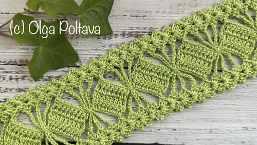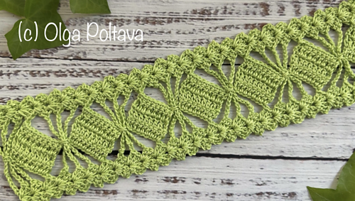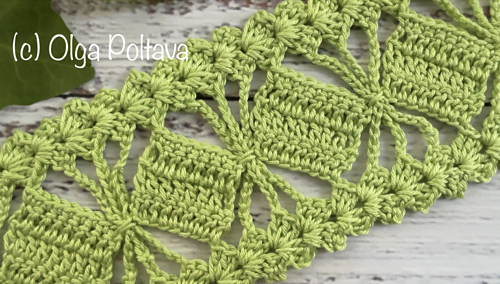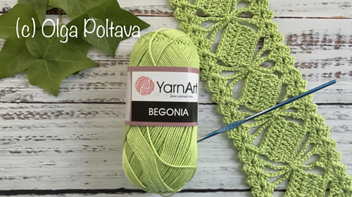 This delicate crochet lace border is worked with category 2, 100% mercerized cotton yarn, specifically YarnArt Begonia, and a 3.25 mm (D) hook.