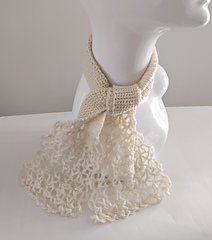 I call this design the waterfall scarf, as the lace detail at the ends reminds me of cascading water. The design is very versatile. It can be worn with a single knot to the front or side, and you can also add your favourite brooch to lengthen the scarf’s look. Alternatively, it can be worn as a headband.