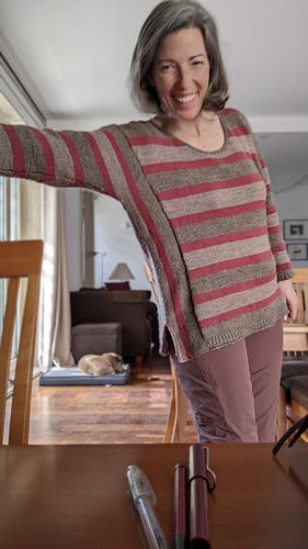 The sweater features an interesting, but simple construction: After the center pieces of back and front have been knitted in horizontal stripes, the side panels are added with the stripes running in a different direction, which has a flattering effect. Increases on the center pieces, starting at the waist, automatically shape the slope of the sleeves.