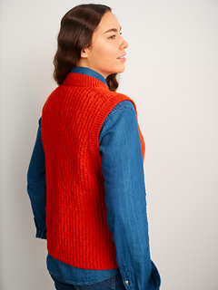 This slipover is knitted from the bottom up in Wavy Stitch Pattern, which consists of blocks of 6 rows (or rounds), repeating every 12 rows (or rounds). First, the front and back are worked separately back and forth to create side slits, then the body is joined and worked in the round to the underarms. The front and back are then worked separately. The back is shaped with German Short Rows to create a shoulder drop. The shoulders are joined with a 3-Needle Bind-Off. The armhole edges and neckline edge are worked in 1 x 1 Rib.