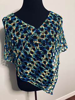 The garment is crocheted into a rectangle to desired length and then wrapped and stitched from the end into the side. Pattern can be adapted in depth and width (guidance in pattern).