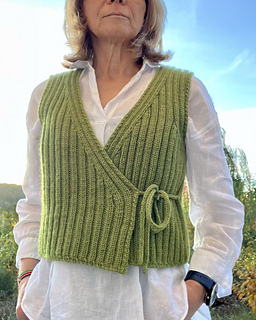Lange Linjer Wrap = Long Lines Wrap is a short casual fitted vest with a V neckline and all over ribbing. The vest has an overlap at the fronts and is tied with I-cord ties into a bow. The vest is worked top-down.