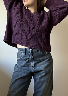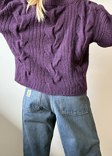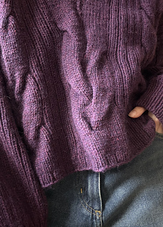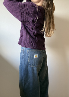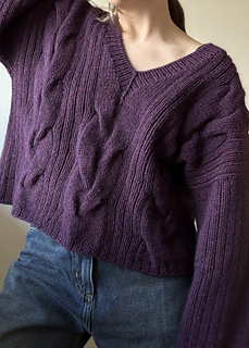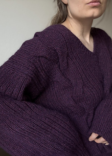 Der startes med at lave masker til nakken, hvorefter skuldrene og senere forstykkerne udformes med løkkeopslag. Når ryggen er færdig, strikkes der masker op til skuldre/forstykker samtidig med at der laves udtagninger til den dybe V-udskæring. Sweateren strikkes rundt i ribstruktur og snoninger. Der strikkes masker op til ærmer og rib i halsen.