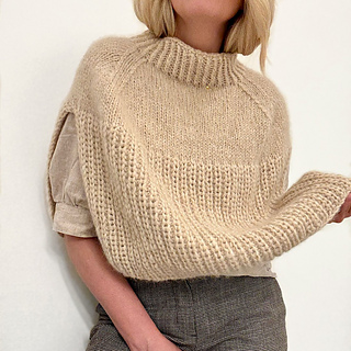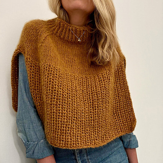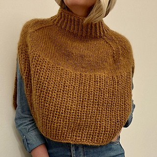 The poncho is knitted bottom-up in half brioche stitch, with a relaxed fit, wide sleeves, and raglan shaping on the yoke.