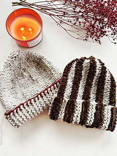 The beanie is knit flat using a mix of garter stitch and stockinette stitch to create a rectangle. The rectangle is then seamed together using the mattress stitch to create a tube, and the top is closed. Instructions for adding colorful stripes are also included!