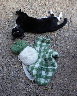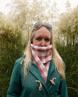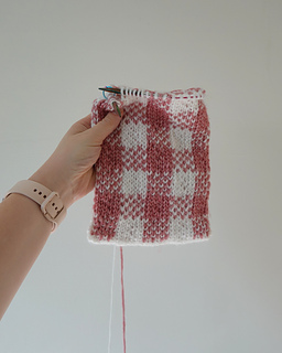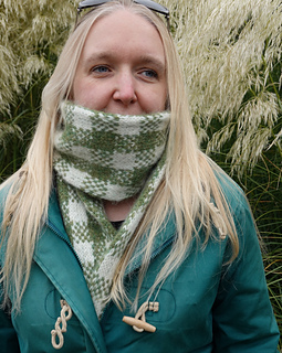 Starting with Judy’s magic cast on, this scarf is knitted bottom up, working in the round in stockinette stitch, following a charted stitch pattern to create the gingham-effect fabric. The end is then grafted closed using Kitchener stitch. The stitch pattern is worked using stranded colourwork where two colours are used at the same time – catching floats is advised.