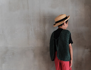 全体を通して、ガーター編みの往復編みで編みます。前身頃と後ろ身頃は、肩の部分ではぎ合わせます。最後に、両方の袖ぐりとベスト全体の縁をぐるりと1周するように目を拾いながら編み、i-cordの縁編みをします。お好みで、オープンファスナー、ボタンとボタンループ、または紐をつけて仕上げます。