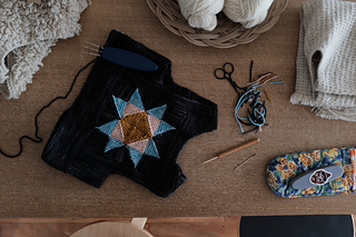 まず、パッチワークブロックを編み、その四辺から目を拾ってパーツを編み足していくことでベストを完成させます。