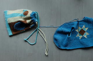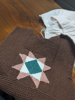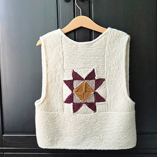 First you make a patchwork block, then pick up the stitches along the four edges (one edge at a time) and knit the rest of the body to complete the vest. It’s knitted back and forth in garter stitch throughout. And the front and back panels are grafted together at the shoulders.