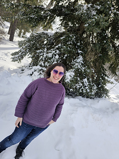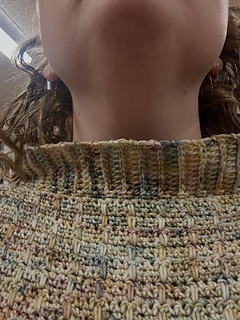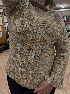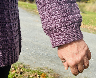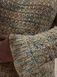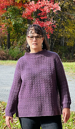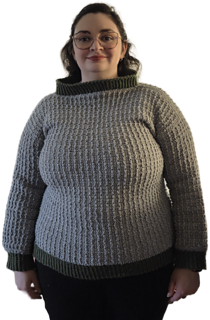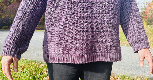 The sweater is constructed in two panels, starting with the waistband and then working up the body. It is then sewn together, with sleeves crocheted onto the body of the sweater. Sleeve ribbing is worked using pre-attached yarn, while the neckline and hemline ribbing are worked using new yarn.