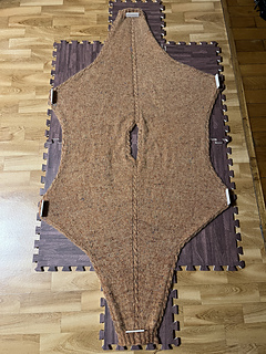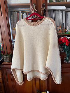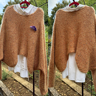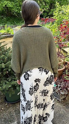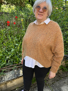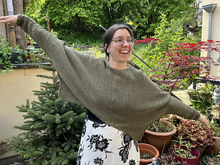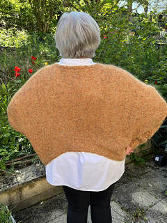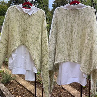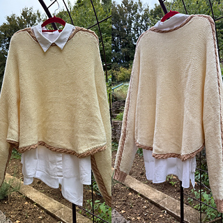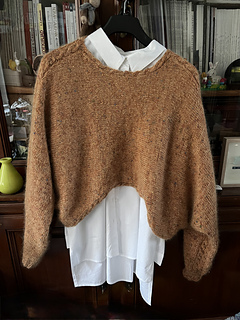 Ce « sur-pull » court, aux manches chauve souris, se tricote en aller-retour, d’une seule pièce d’une manche à l’autre.